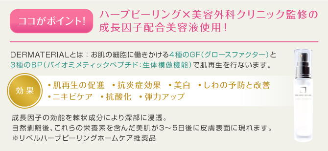 成長因子100%美容液(ダーマテリアル)を真皮にまで届けることでターンオーバーを促進、自然剥離を起こしやすくし、効果を増大させます。