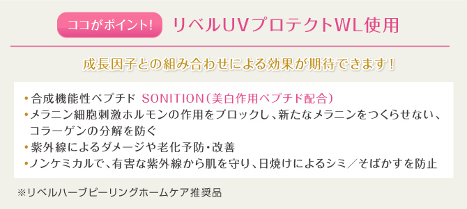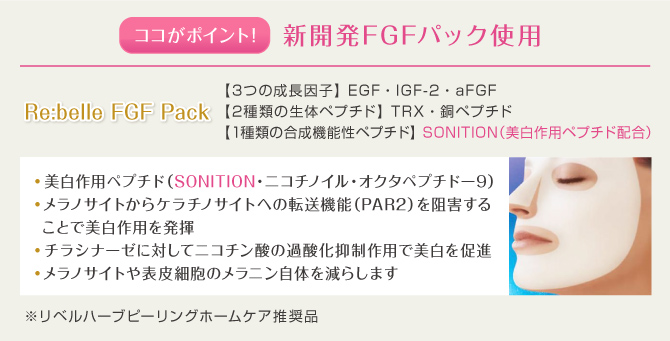 従来のピーリングは、肌の角質を科学的なピーリング剤などで剥離させますが『Re:belle』は、棘状成分を浸透させ成長因子を深部まで導入することにより肌のターンオーバーを28日~40日、長い方では60日~100日かかる周期を3~5日という短時間で肌再生・自然剥離を行います。