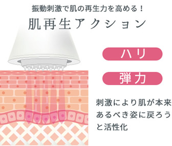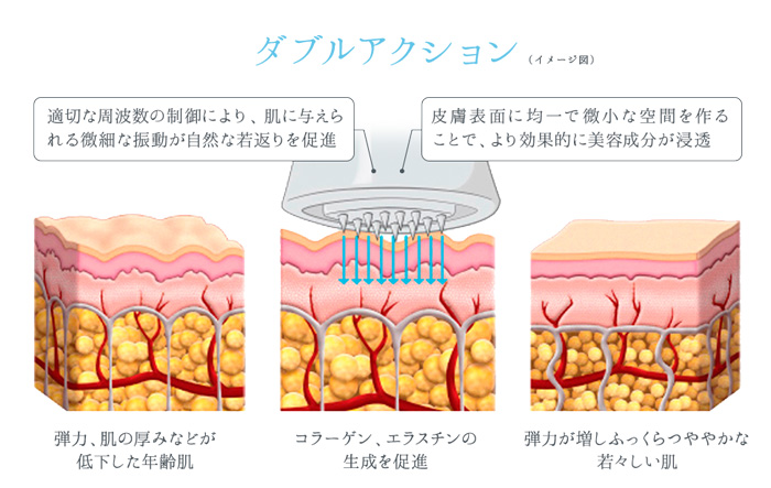 | コラーゲンブースターが与える微細振動が、肌の内部へ刺激を伝えることで肌の再生メカニズムが活性化。ドットアプローチにより肌そのものが本来あるべき姿に戻ろうとし、コラーゲン・エラスチンの生成を促進します。 | コラーゲンブースターにより一時的に作られた隙間を通じて、美容成分が肌の奥※まで浸透。 エイジングケアの結果を左右するのは、美容成分がどれだけ肌に浸透するかどうか。 メタジェクト独自のドットアプローチにより、微小な隙間から美容成分が導入されていきます。※角質層まで |
