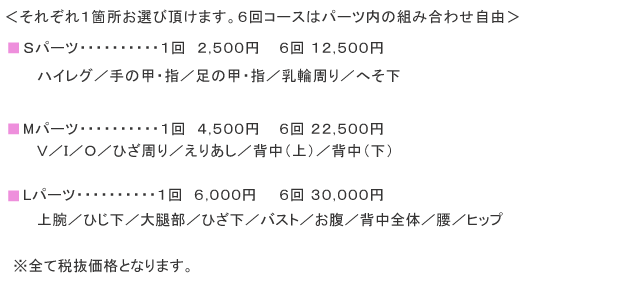 毛はおおよそ2ヶ月の周期で成長し抜け落ちます。その周期の中で脱毛効果があるのは成長期の毛だけです。毛周期にあわせて2ヶ月間隔でコースをお受け頂くことで短期間でより高い効果を実感頂けます。自己処理もほとんど必要ありません。
